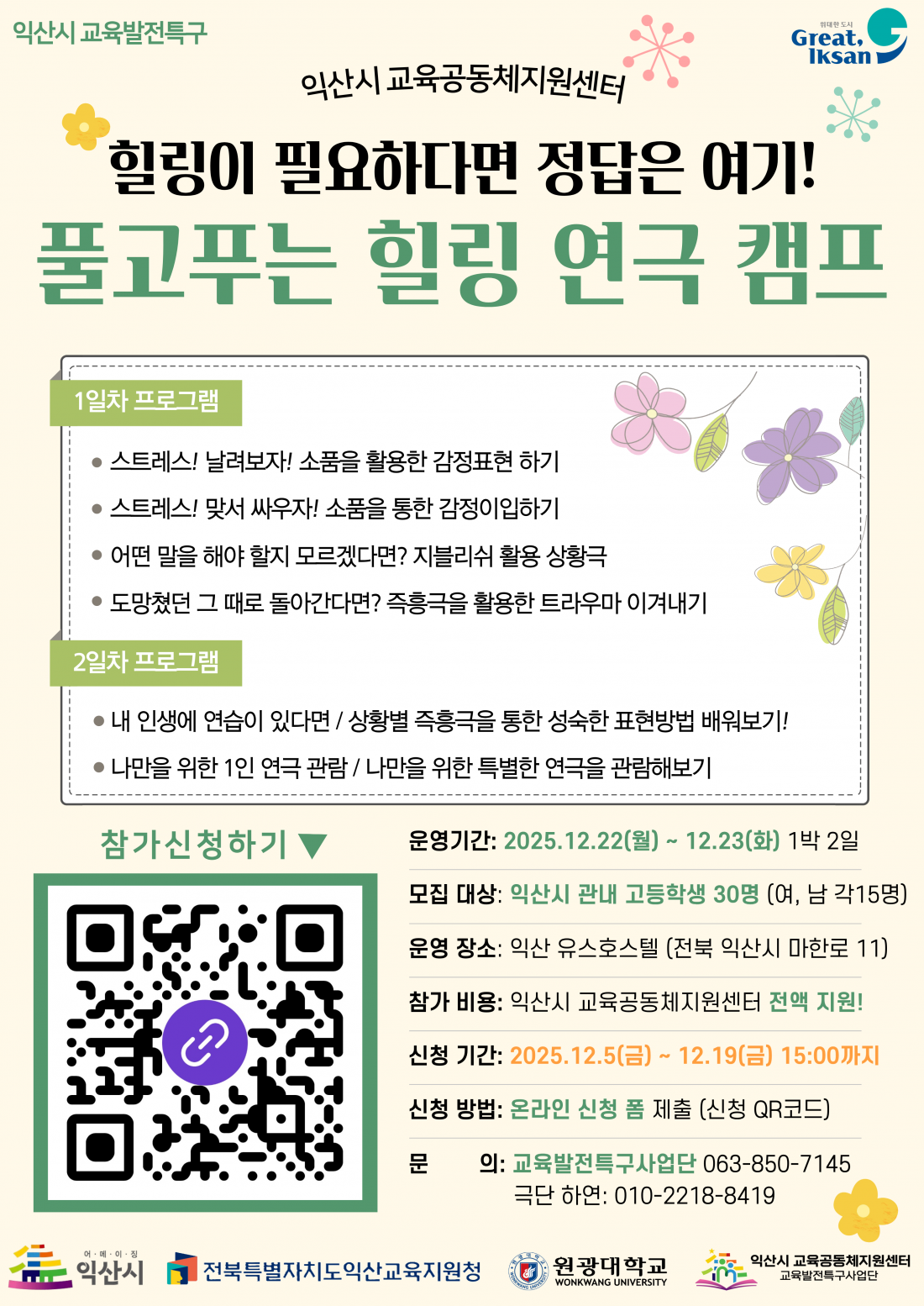 익산시 교육공동체지원센터에서 고등학생을 위한 1박2일 힐링 연극 캠프 참가자를 모집합니다!